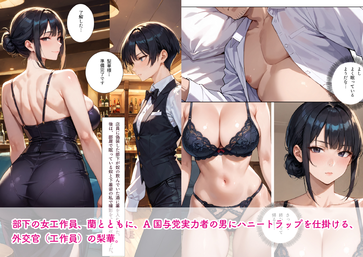外交官の娘で秘書の梨華は、A国の与党実力者をハニートラップに貶める作戦に参加するが、敵に気絶させられ捕まってしまう。